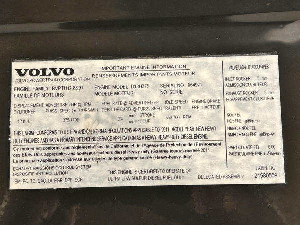Pulled From 2012 Volvo VNL, Engine Family: BVPTH12.8S01, ESN:D13-964921-H1-H.