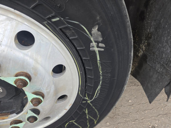 STARTED ON SITE, FULL OPERATIONS NOT TESTED. Warning Lights Present, Left Front Tire Has Split In Sidewall.