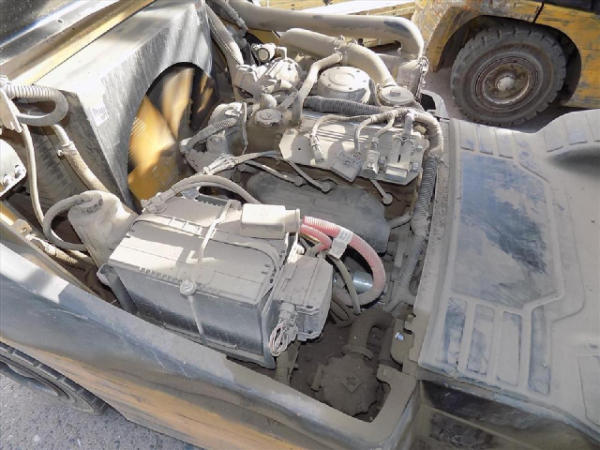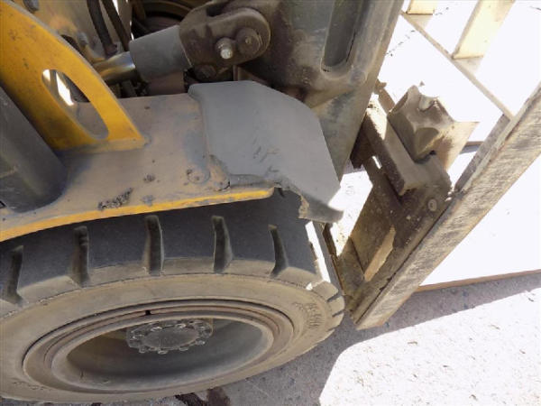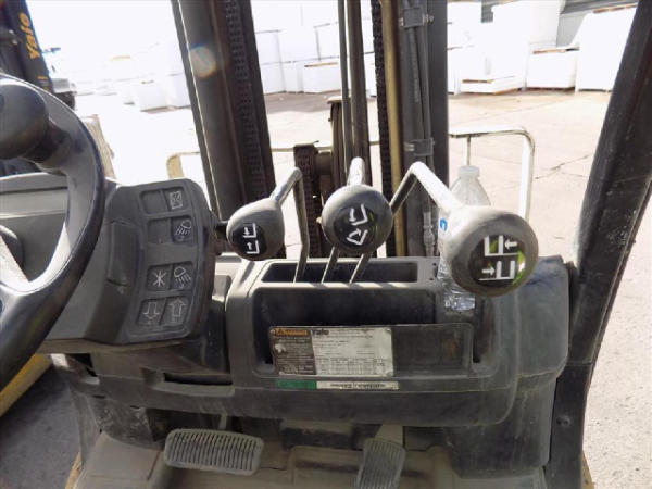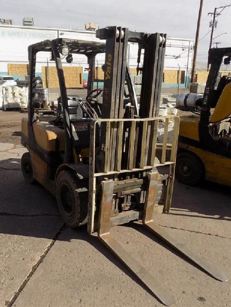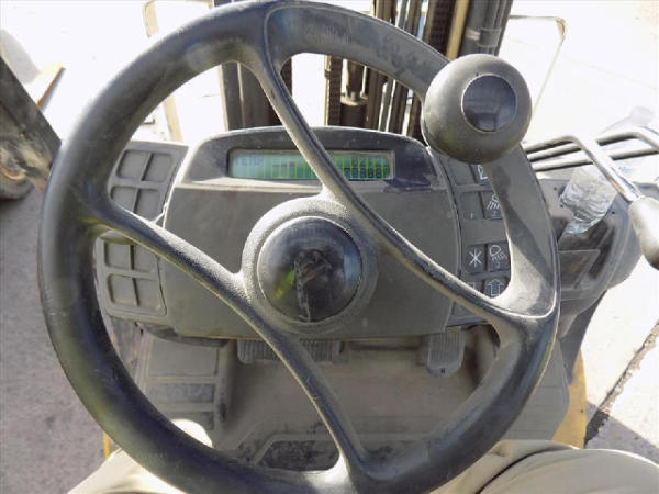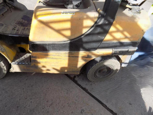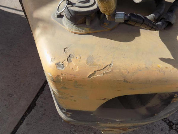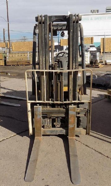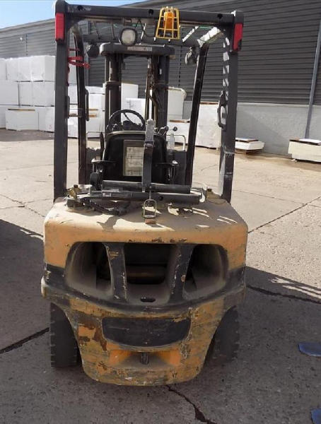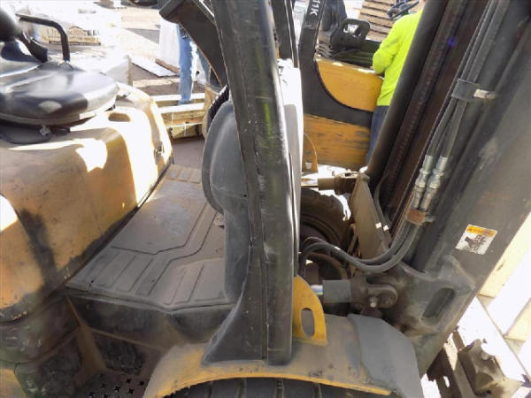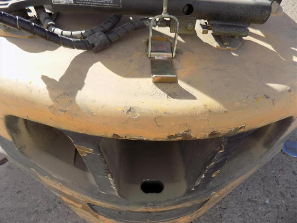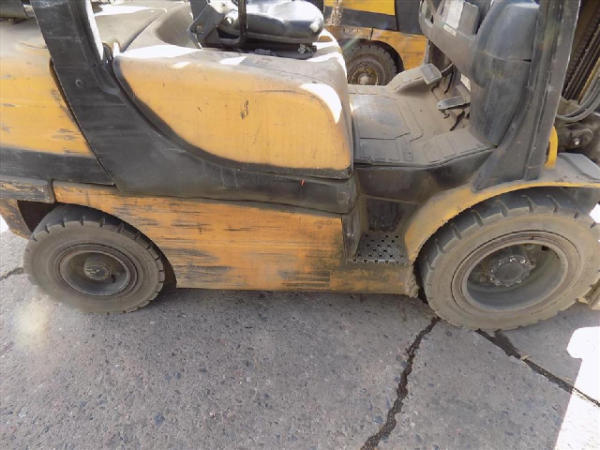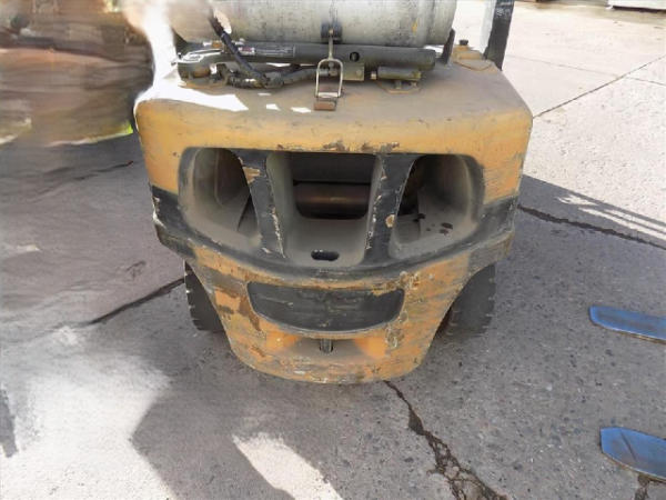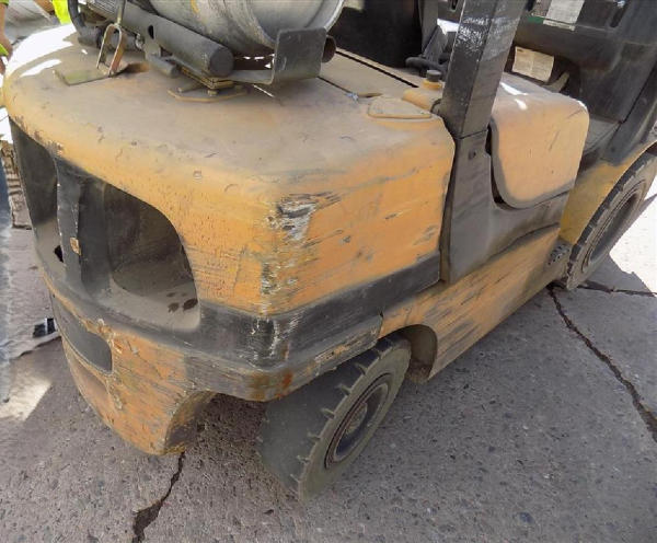 NOT TITLED PER STATE REGULATIONS. STARTED ON SITE, FULL OPERATIONS NOT TESTED. SEAT TORN. CHIPS AND SCRATCHES THROUGHOUT UNIT. FORK CARRIAGE BENT ON TOP. FRONT FENDERS DAMAGED. LESS AIR FILTER. HYDRAULIC HOSES LEAKING. RADIATOR LEAKING. CHAINS STRETCHED. NON COMPLIANT FORKS. LESS REVERSE MIRRORS. NEEDS NEW BELTS. TIRES WORN. LP TANK NOT INCLUDED.